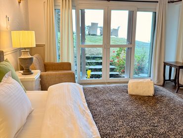 The interiors are elegantly decorated with a cozy ambiance that's perfect for relaxing with a good book or simply taking in the natural beauty outside